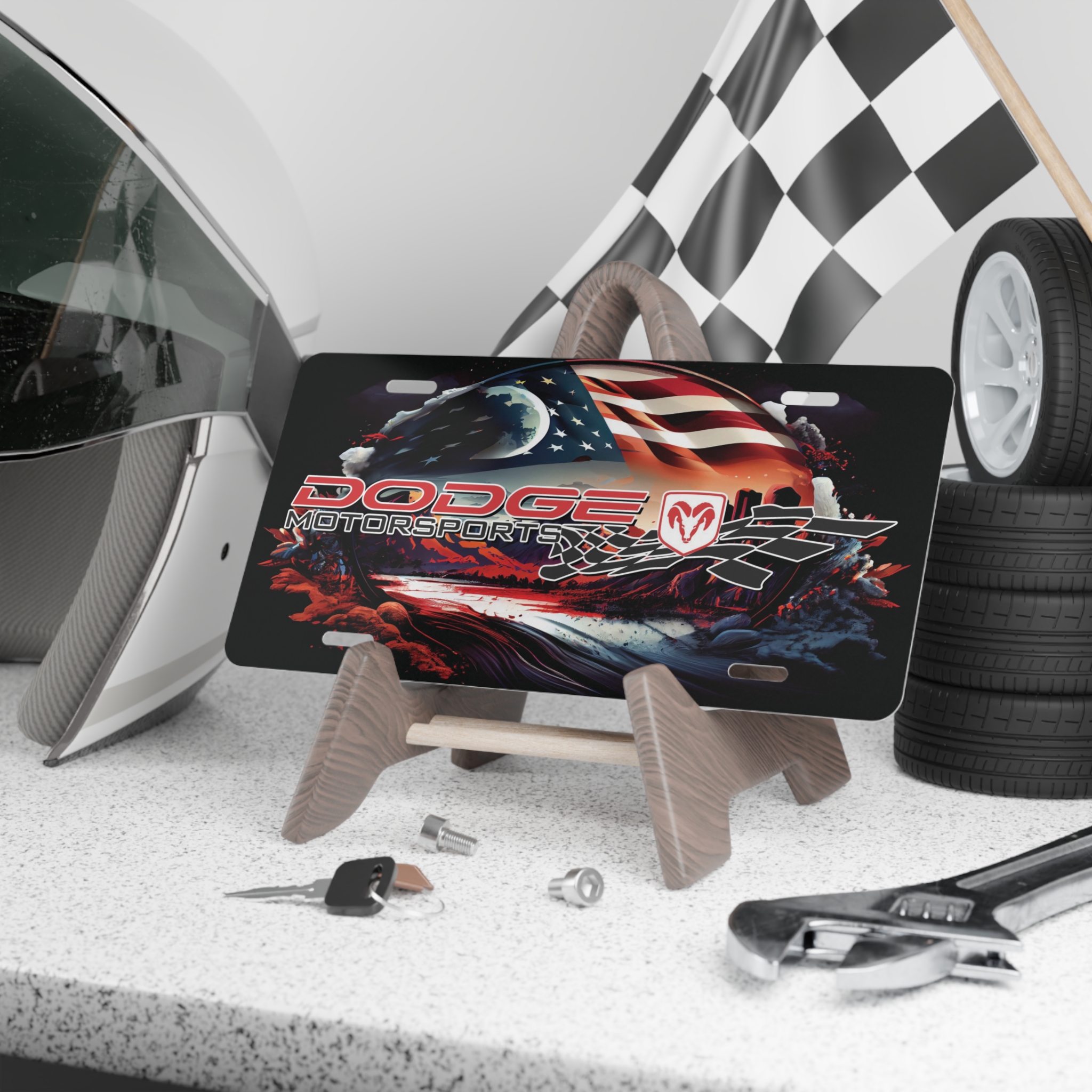 Custom Vanity Plate Tag With Patriotic USA Flag And Dodge Logo